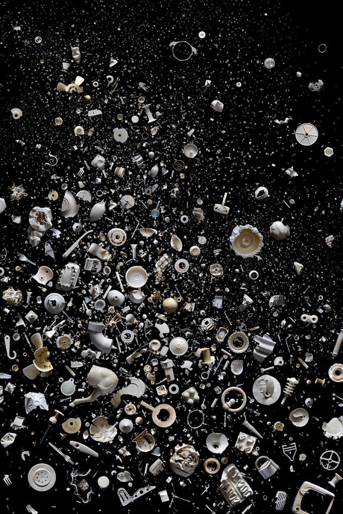 I lavori di Barker sono spiazzanti: non c’è il rifiuto sulla spiaggia, non c’è il cavalluccio marino aggrappato a un cotton-fioc. I frammenti di plastica vengono raccolti, fotografati su un fondo nero e poi inseriti in grandi composizioni, insieme a centinaia di altri. L’effetto è quello di una grande esplosione, quasi una nube di gas stellari, che deve essere osservata da vicino affinché sia possibile cogliere tutte le storie che l’ammasso di soggetti racconta.
